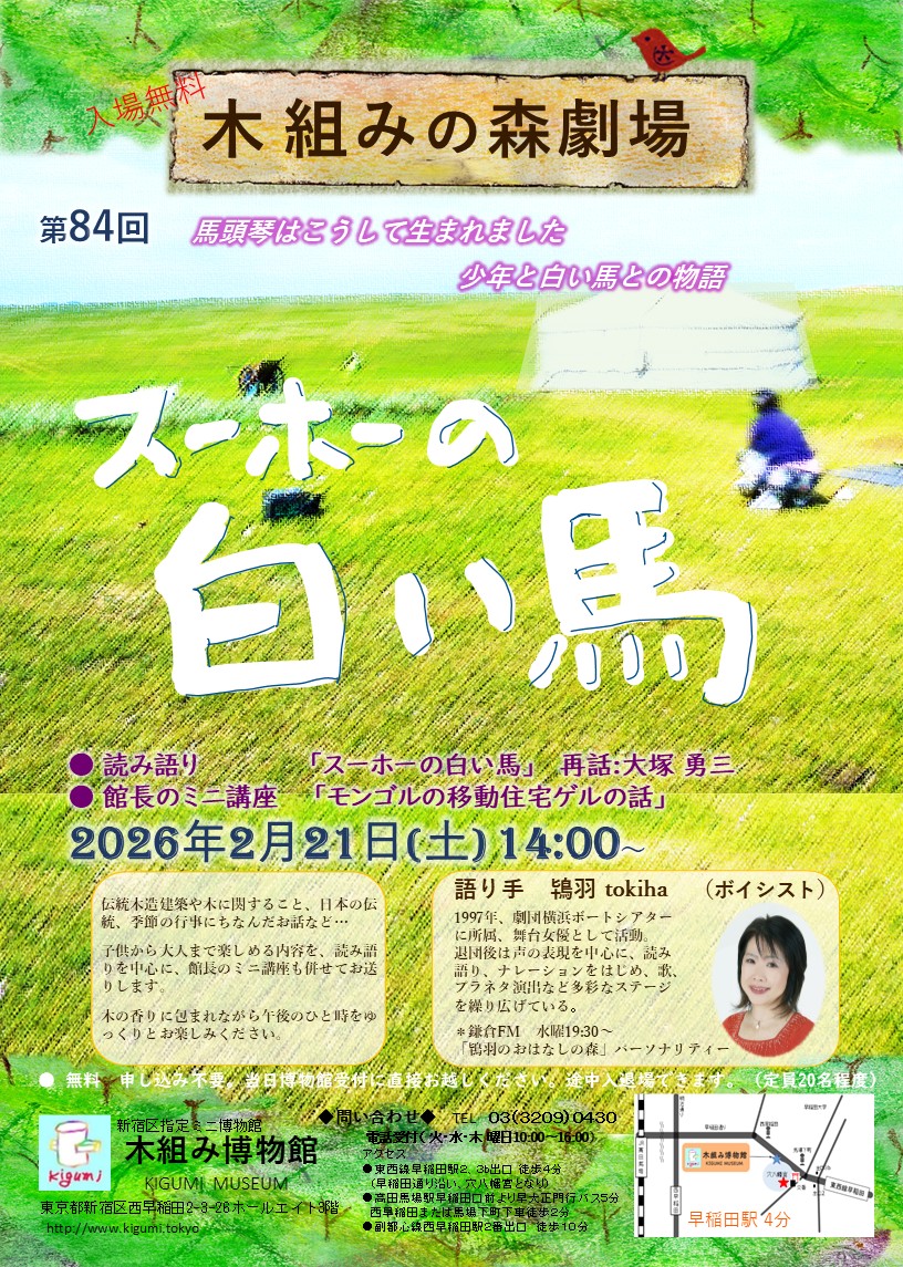 「読み語り木組みの森劇場、2月はスーホーの白い馬」